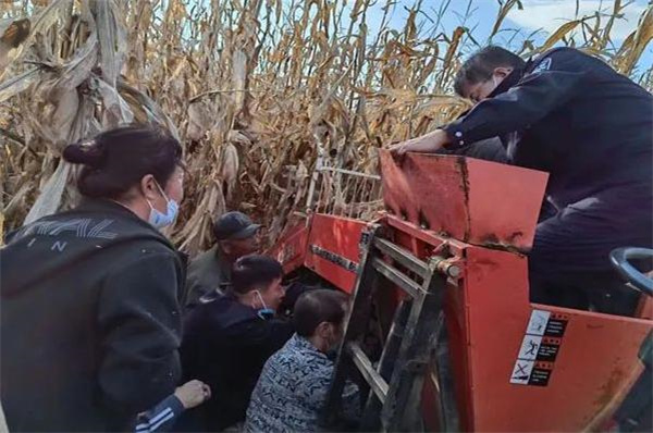 本网吉林讯:2022年11月4日15时许,榆树市公安局五棵树派出所接到一群众报警求助称:其家属在五棵树合发村1组自己家的地里用机械收割玉米时,手被卡在收割机里,情况危急,已经拨打120急救中心了,现在不知道该怎么办,请求民警给予帮助。