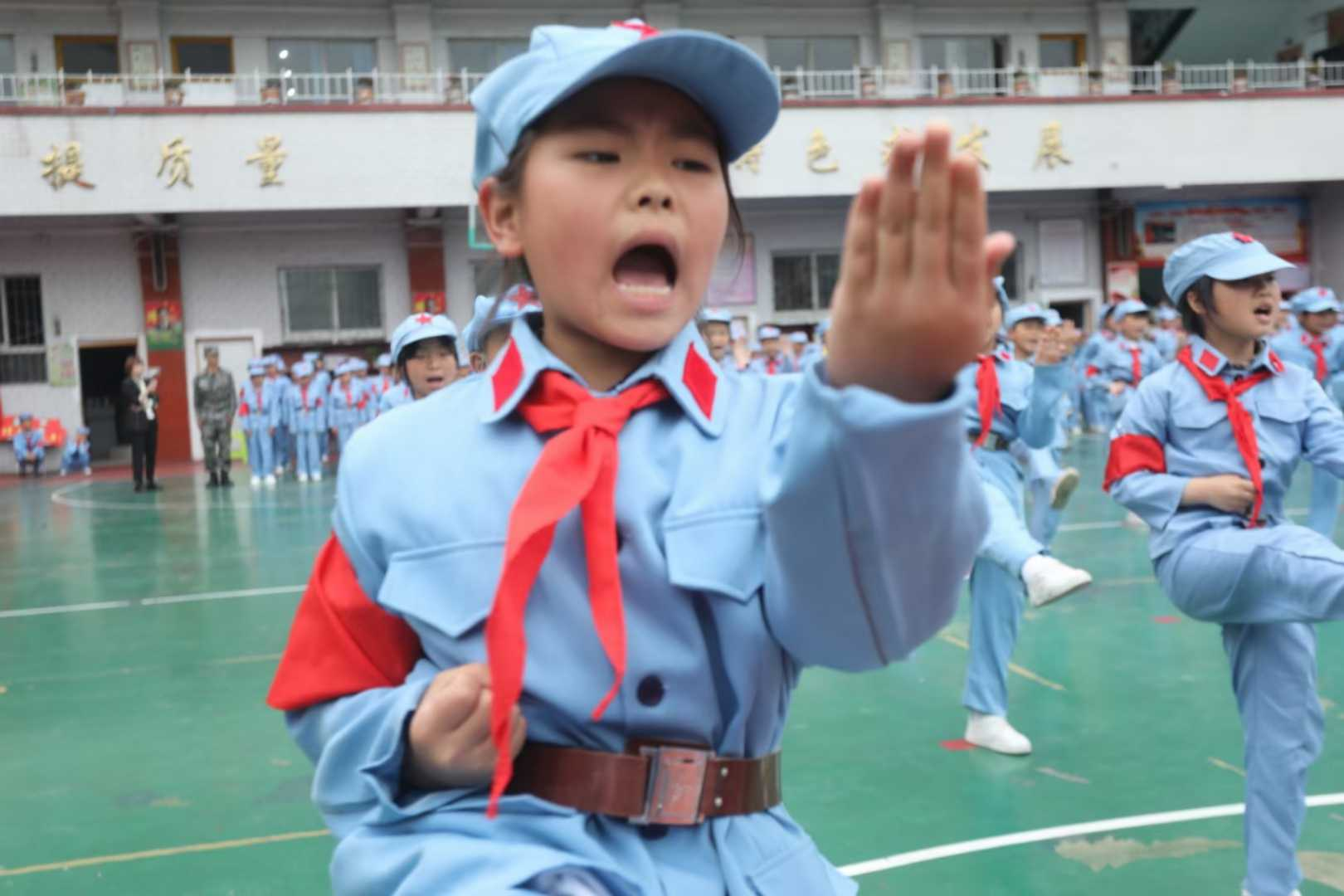 六一儿童节之际,军事教官、老师、同学们,在课余的时间里,在烈日下、阴雨中付出的辛勤汗水,到了收获硕果的季节 ——四年级8个班420名红军班同学,身着红军服装,腰扎武装带,排着整齐的方队,齐步入扬,正步通过了检阅台。从齐步变为正步,“小红军”展现了端庄形象,那以及整齐划一的正步,也体现体现出严谨的威仪和高昂的士气;