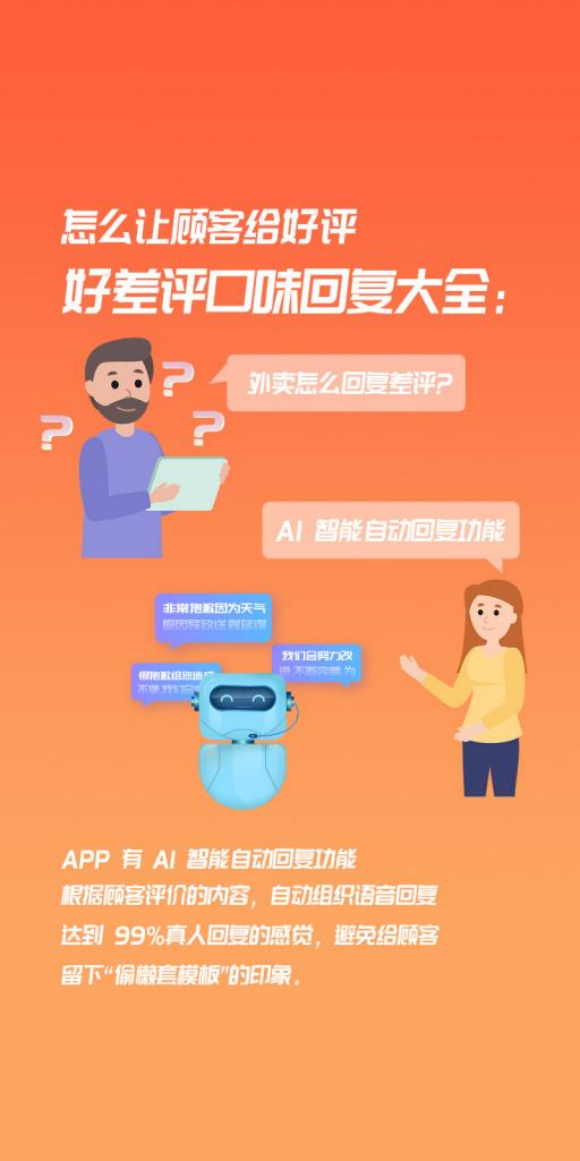 并且黄友祥也说道:及时回复处理顾客评价,前15条尤其重要。“好外卖App”有AI智能自动回复功能,根据顾客评价的内容,自动组织语音回复,达到99%真人回复的感觉,避免给顾客留下“偷懒套模板”的印象。